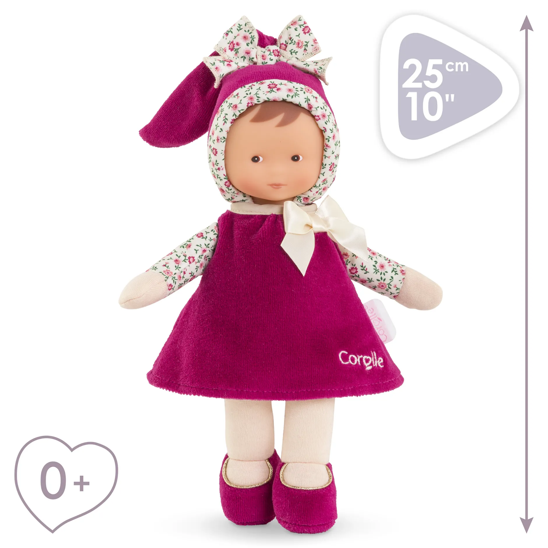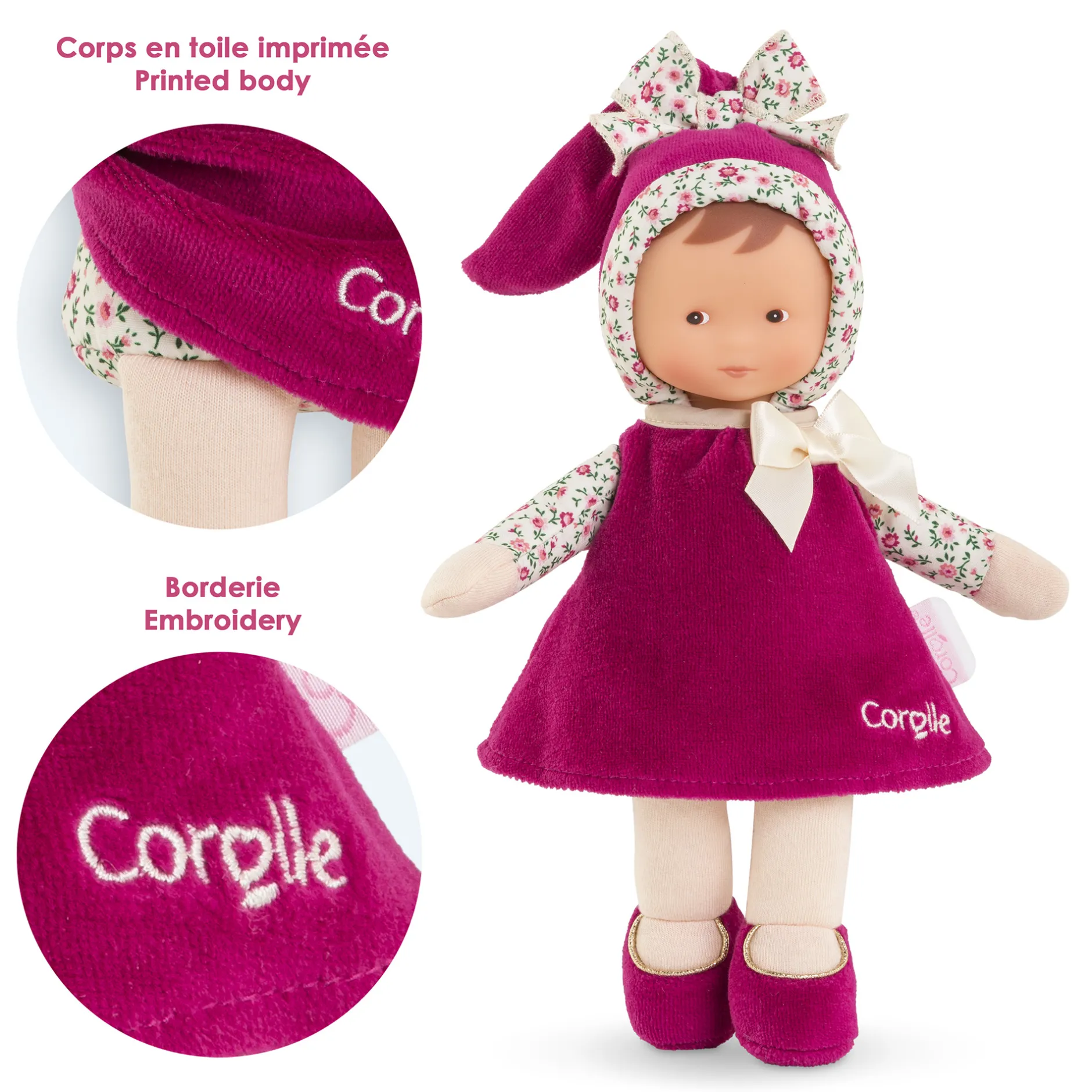 Le doudou Miss Rose Grenadine a la peau blanche et les yeux marron peints. La Miss est habillée d’une robe en velours rose framboise toute douce avec un joli noeud satiné autour du cou. Sa toile de corps est imprimée dans un joli motif fleuri. Elle porte un bonnet rose framboise tout doux et un joli noeud avec des fleurs. De jolis détails dorés visibles sur ses ballerines ainsi qu’une jolie broderie Corolle viennent sublimer cette Miss.