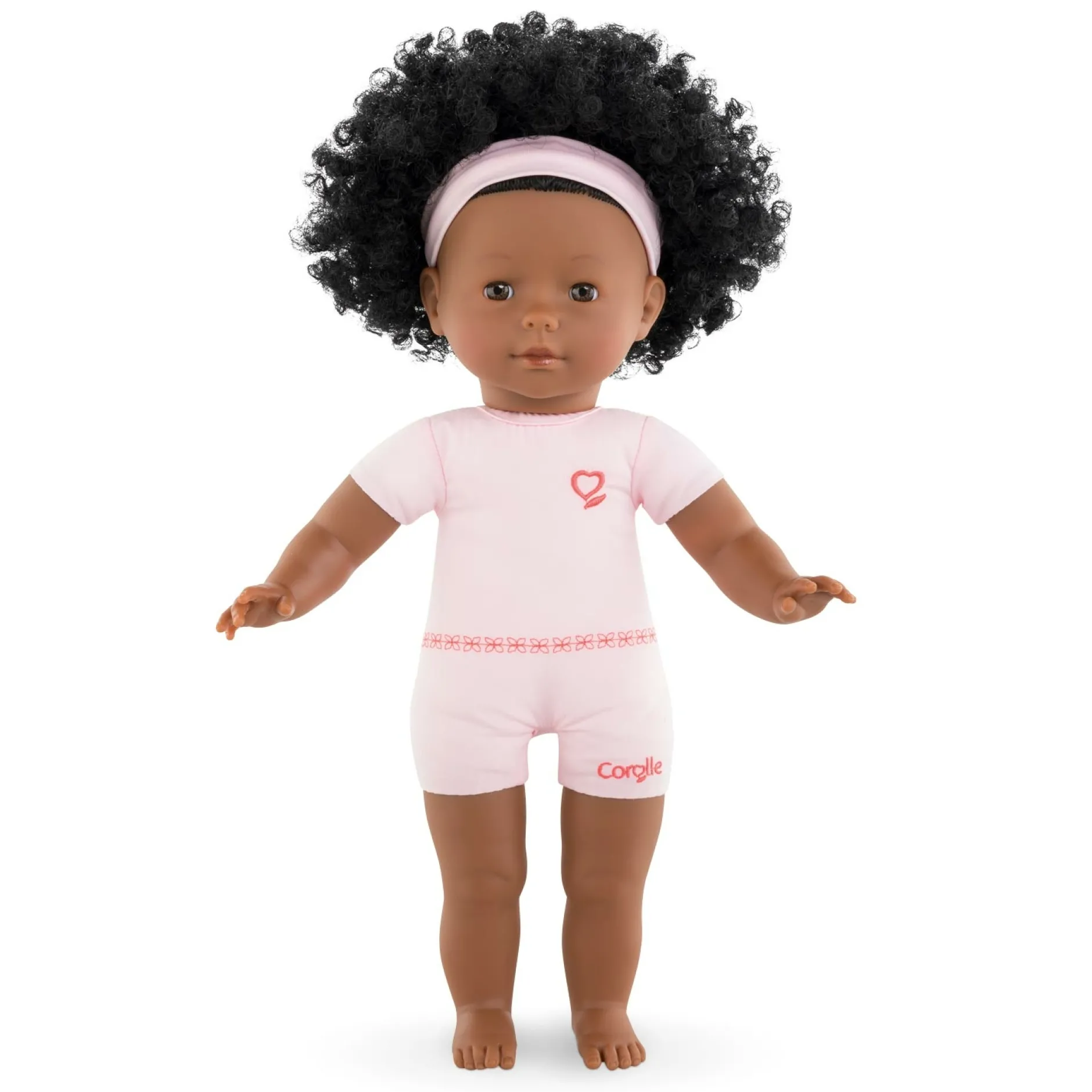 La Poupée à habiller ma Corolle Pauline est une poupée à la peau noire de 36 cm au corps souple « effet » sous-vêtement avec des cheveux frisés à coiffer. Elle a les yeux marron.