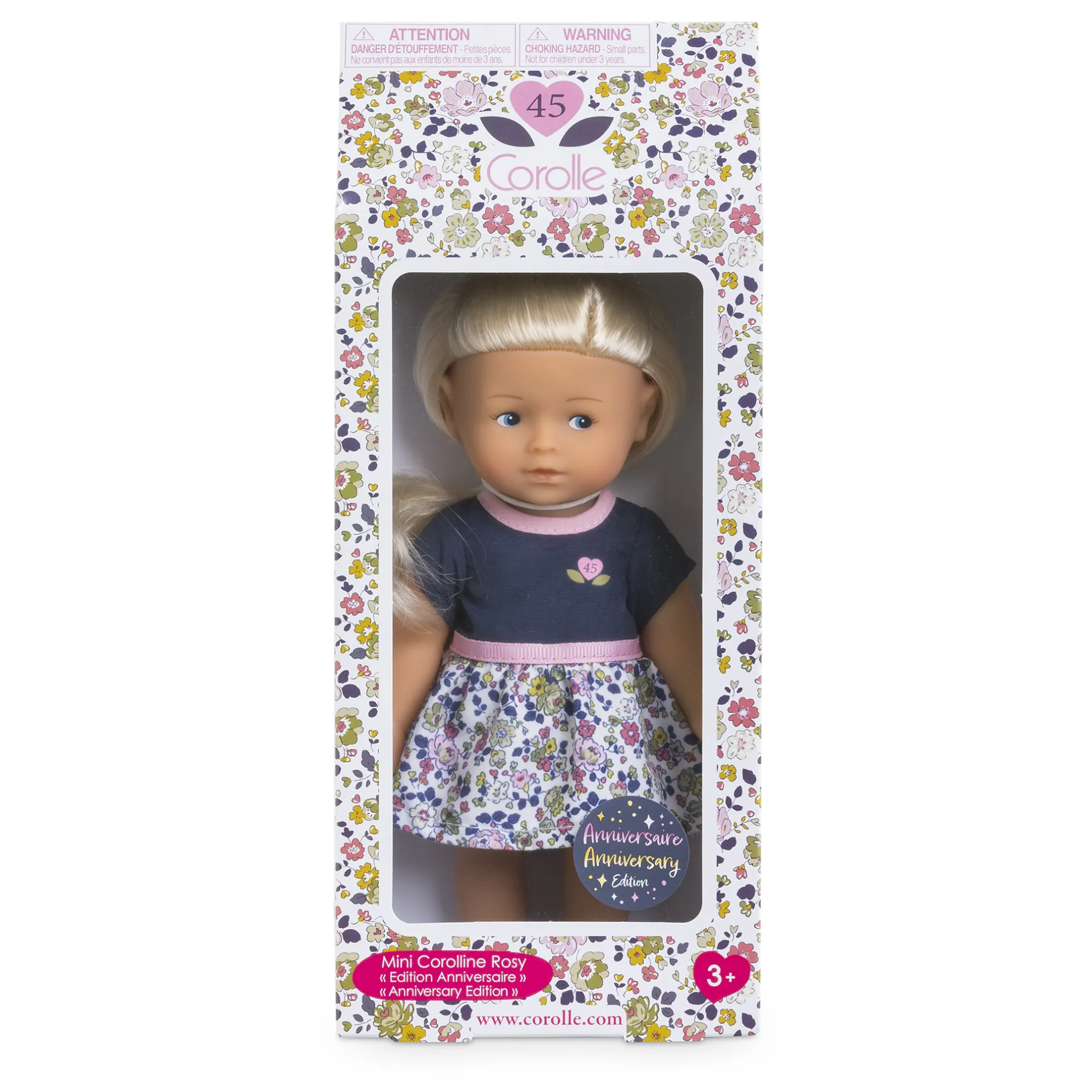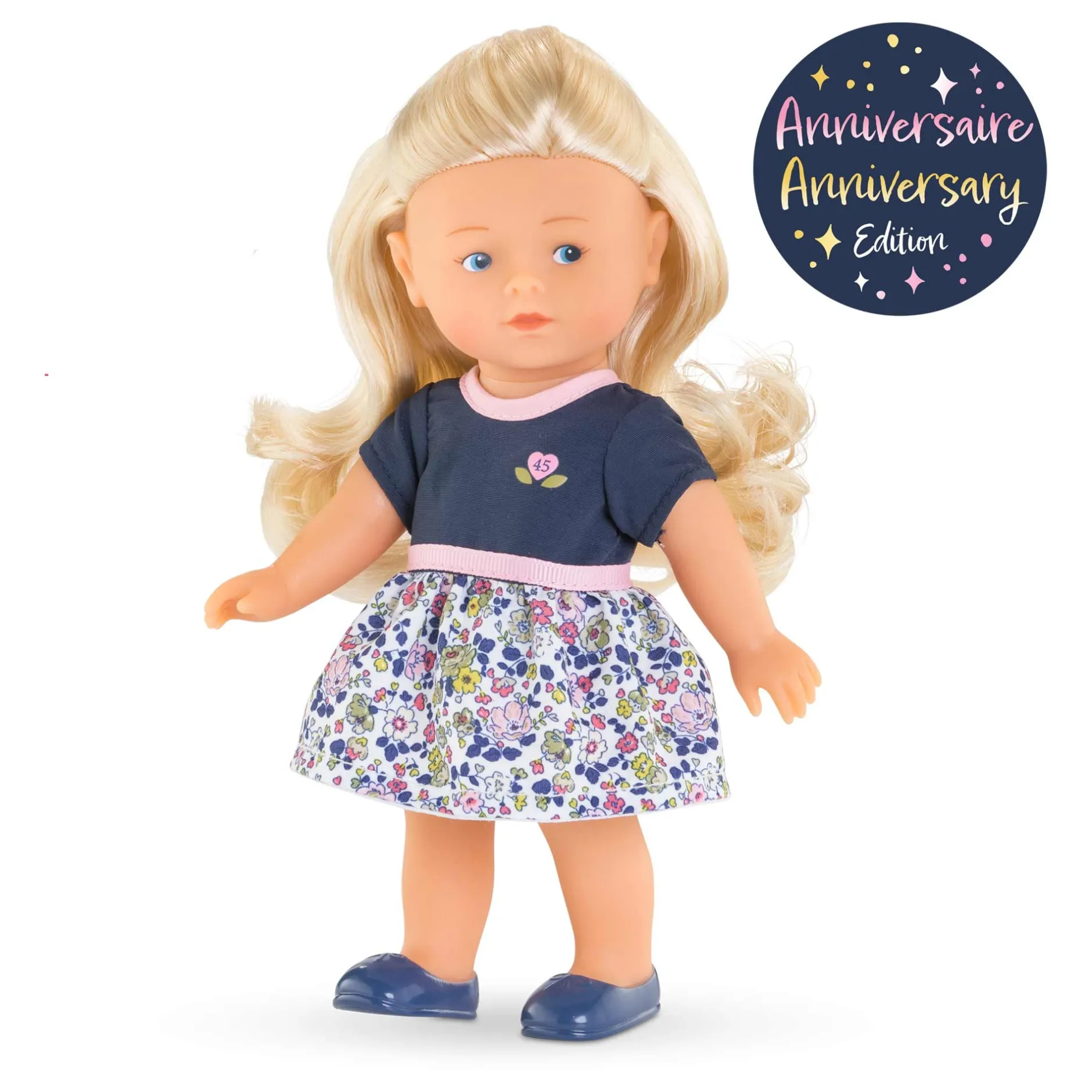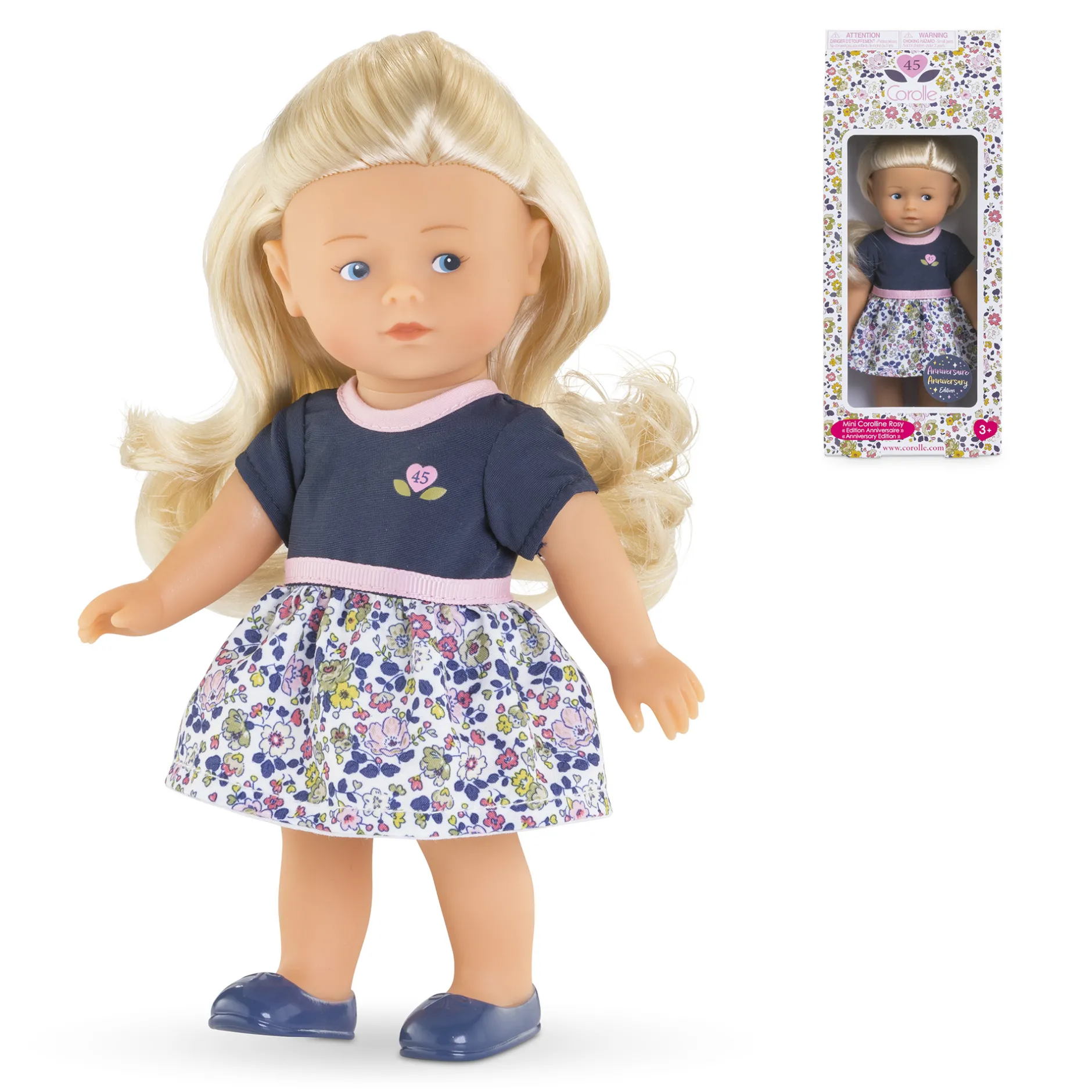 À l’occasion de ses 45 ans, Corolle a voulu proposer cette mini poupée blonde habillée d’une jolie robe fleurie. Le haut de la robe, aux manches courtes, est bleu marine avec une sérigraphie « 45 » au coeur Corolle, le col et la ceinture sont dans un biais rose.