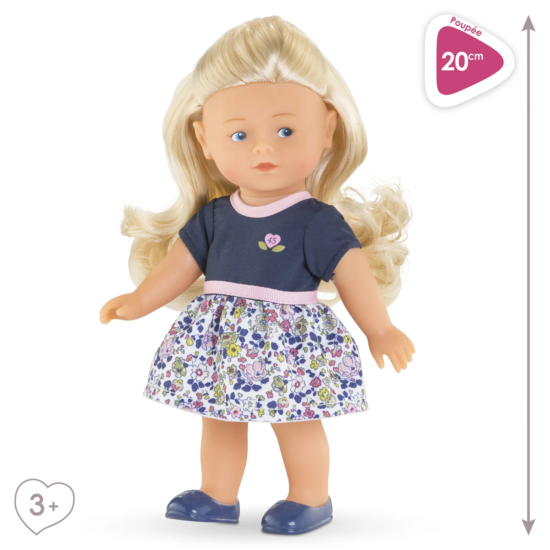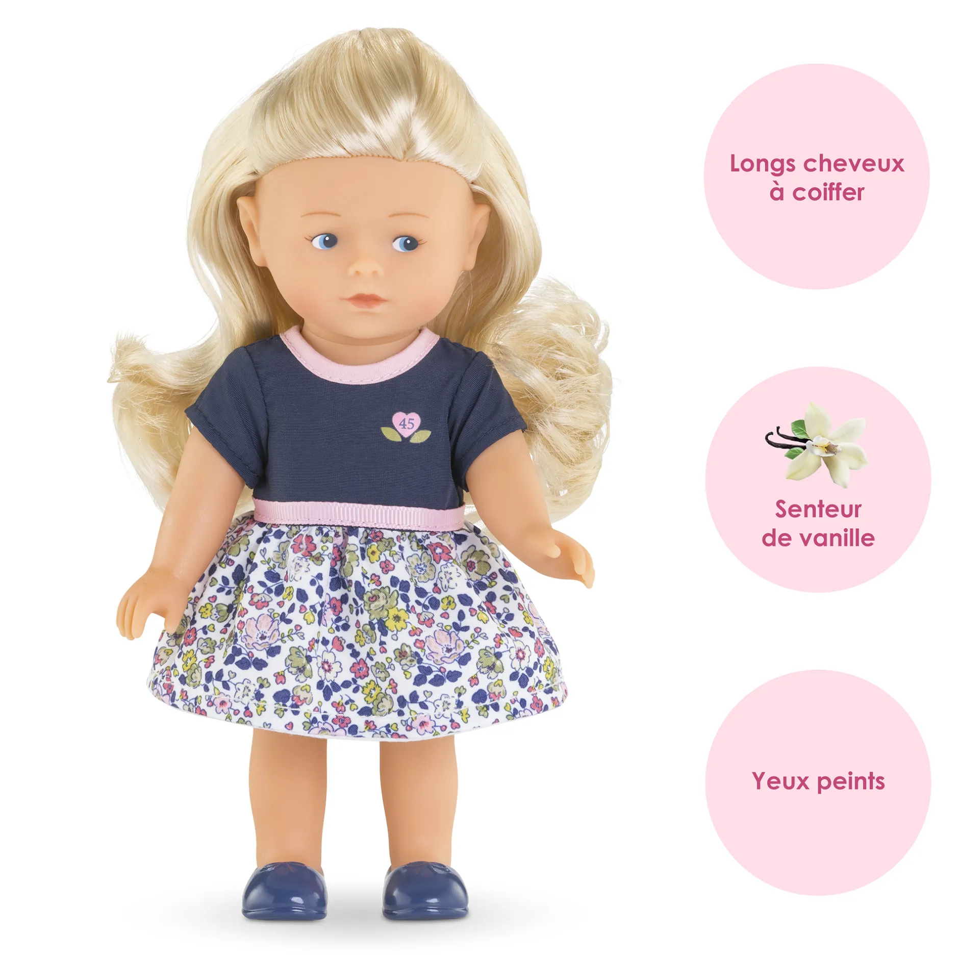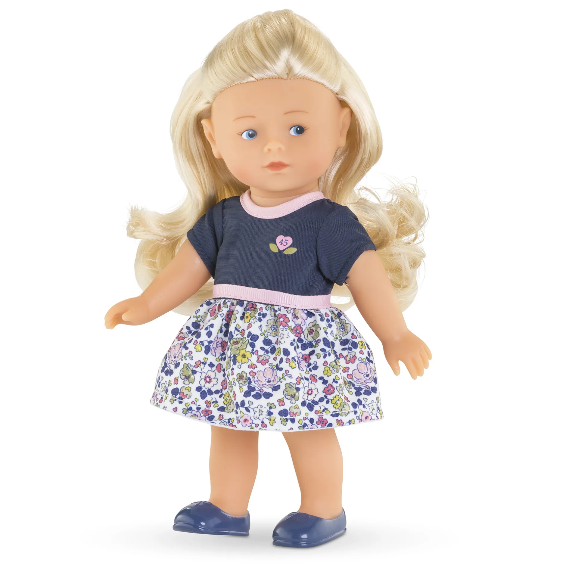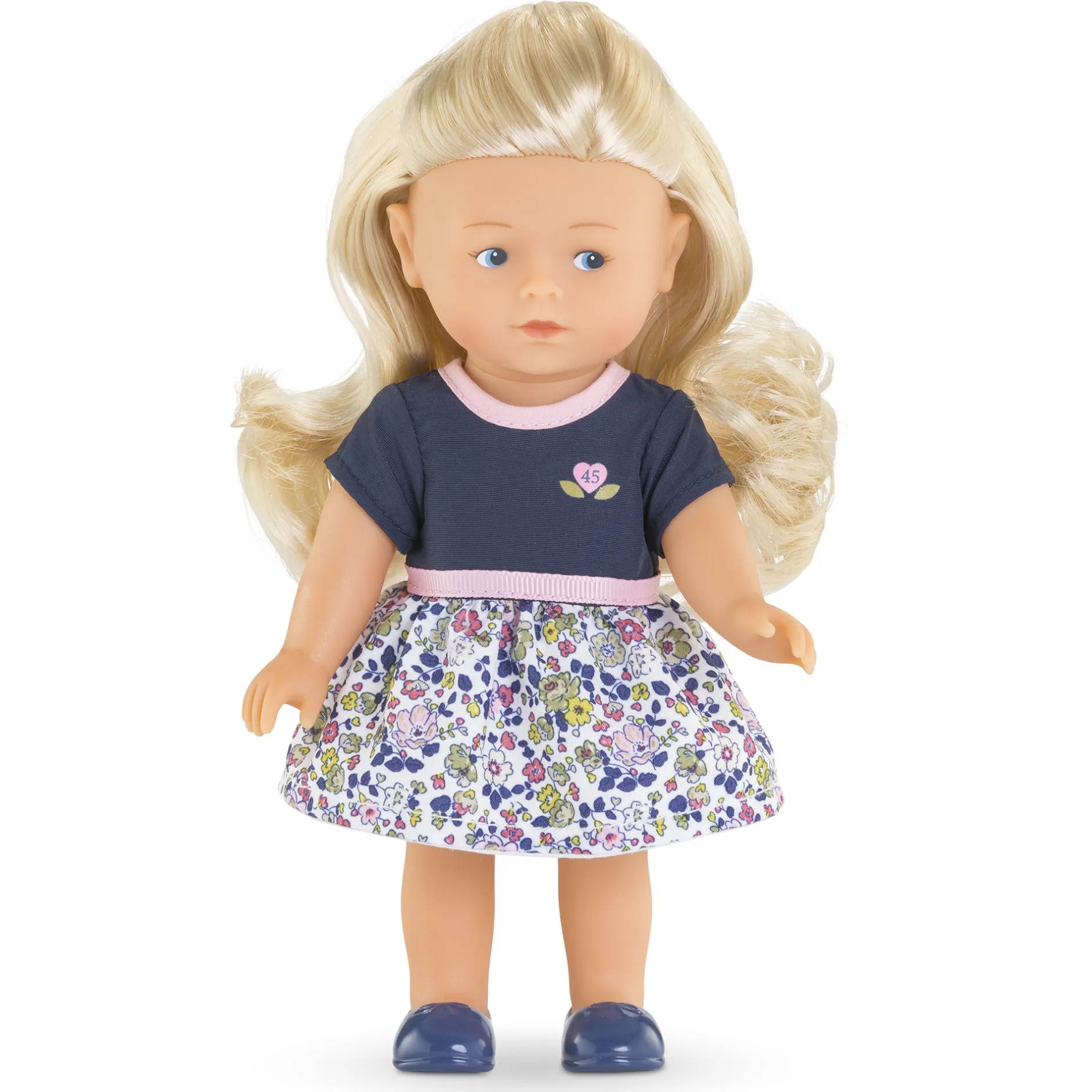 À l’occasion de ses 45 ans, Corolle a voulu proposer cette mini poupée blonde habillée d’une jolie robe fleurie. Le haut de la robe, aux manches courtes, est bleu marine avec une sérigraphie « 45 » au coeur Corolle, le col et la ceinture sont dans un biais rose.