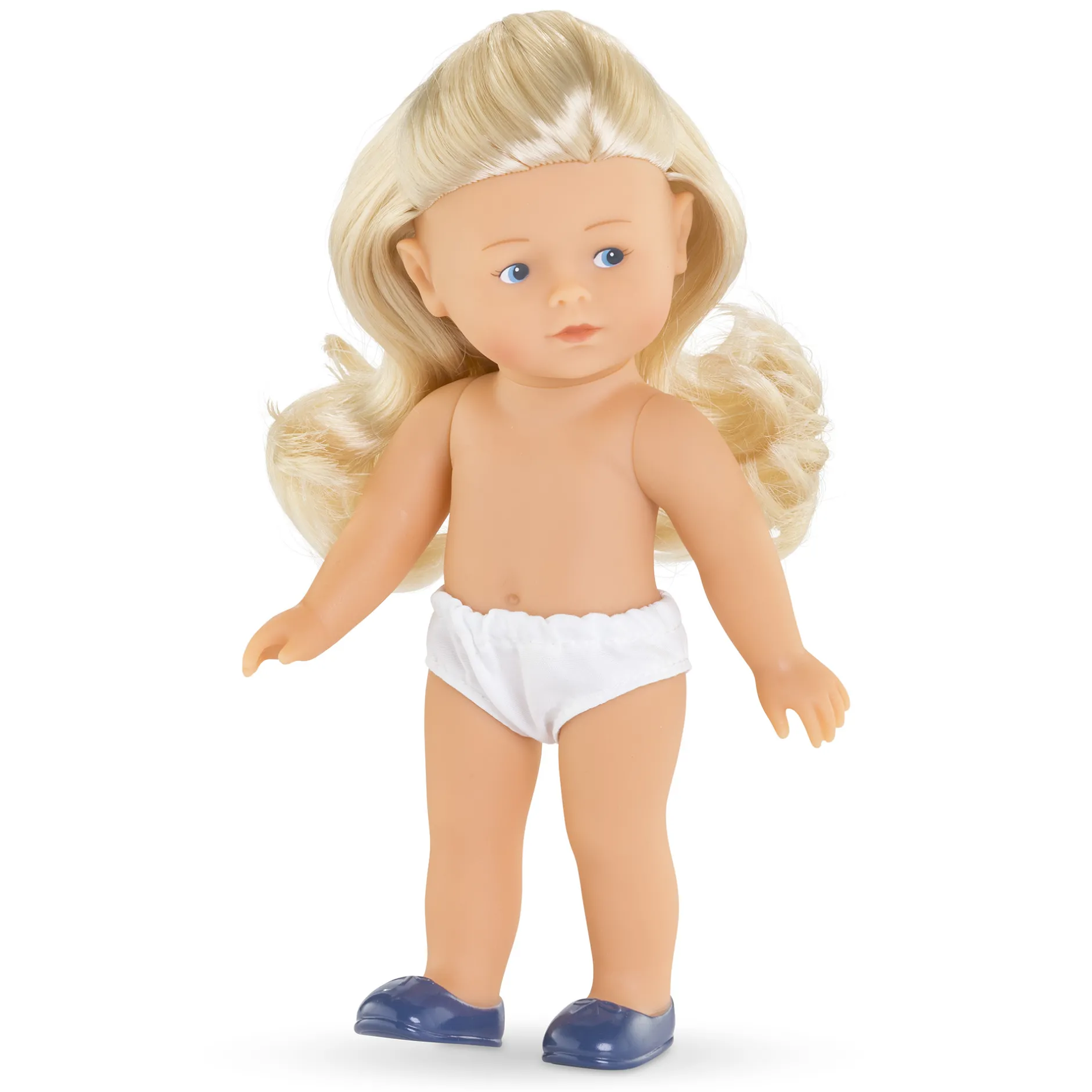 Cette poupée mini Corolline porte également une culotte blanche et une paire de chaussures bleu marine moulées assorties.