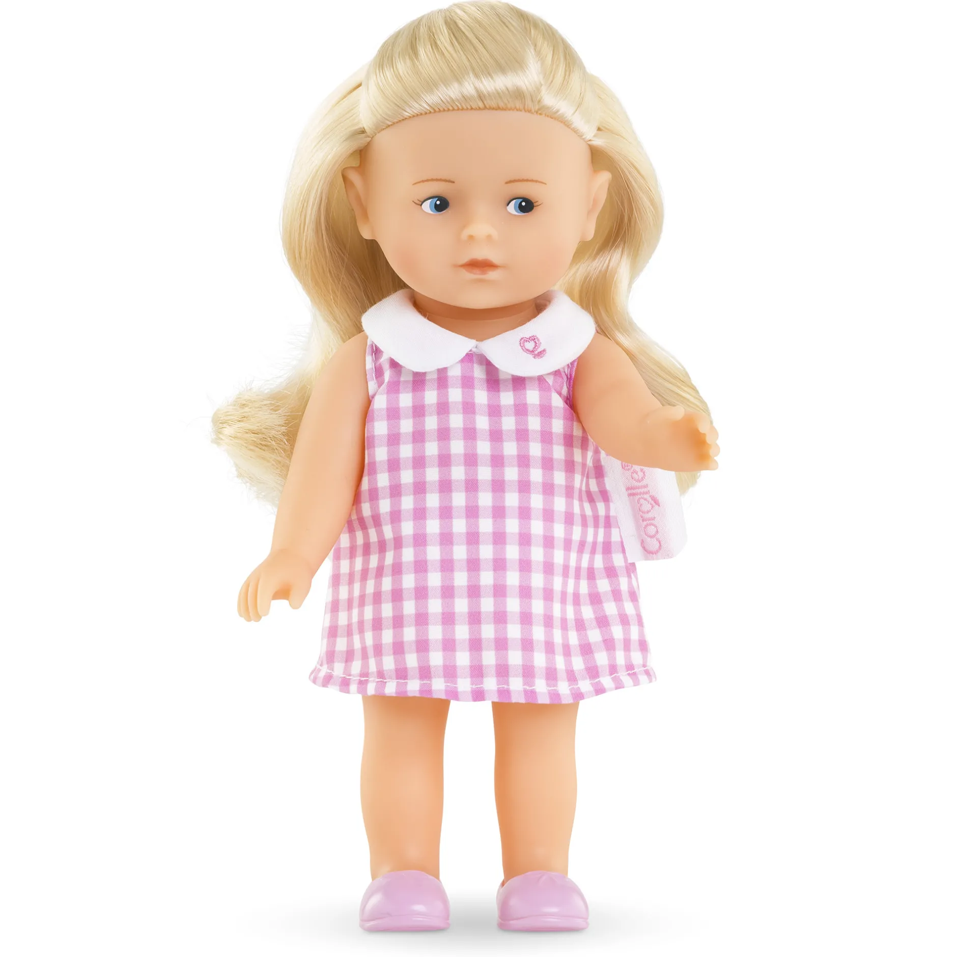 Elle est habillée d’une robe à carreaux vichy rose et blanc avec un col « Claudine ». Cette poupée Mini Corolline porte également une culotte blanche et une paire de chaussures rose moulées assorties.