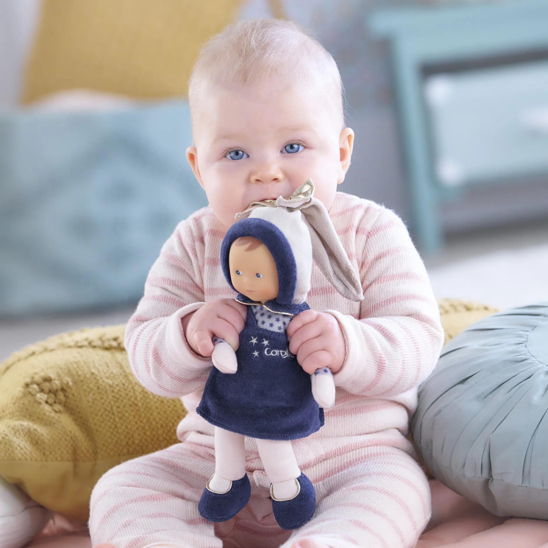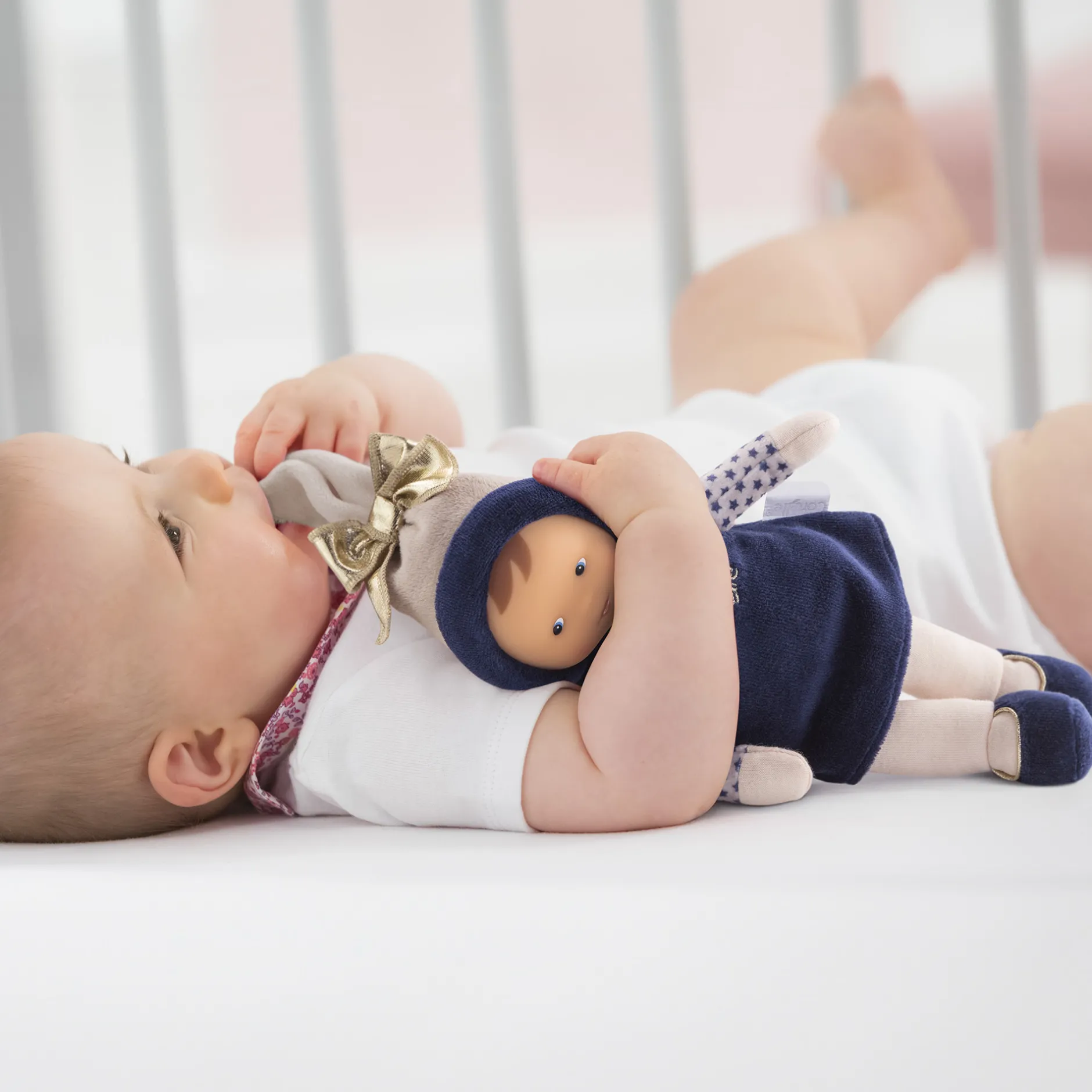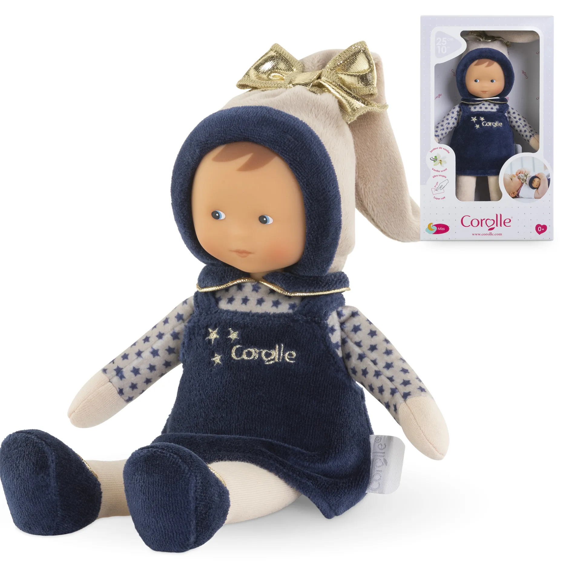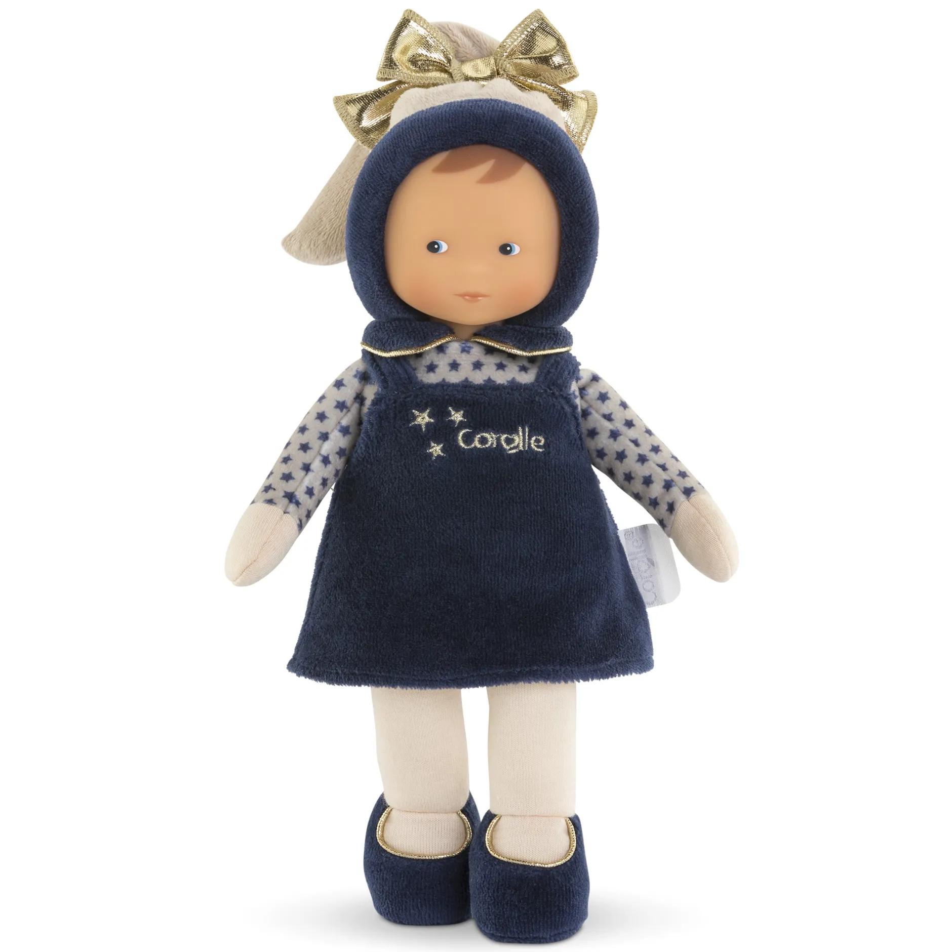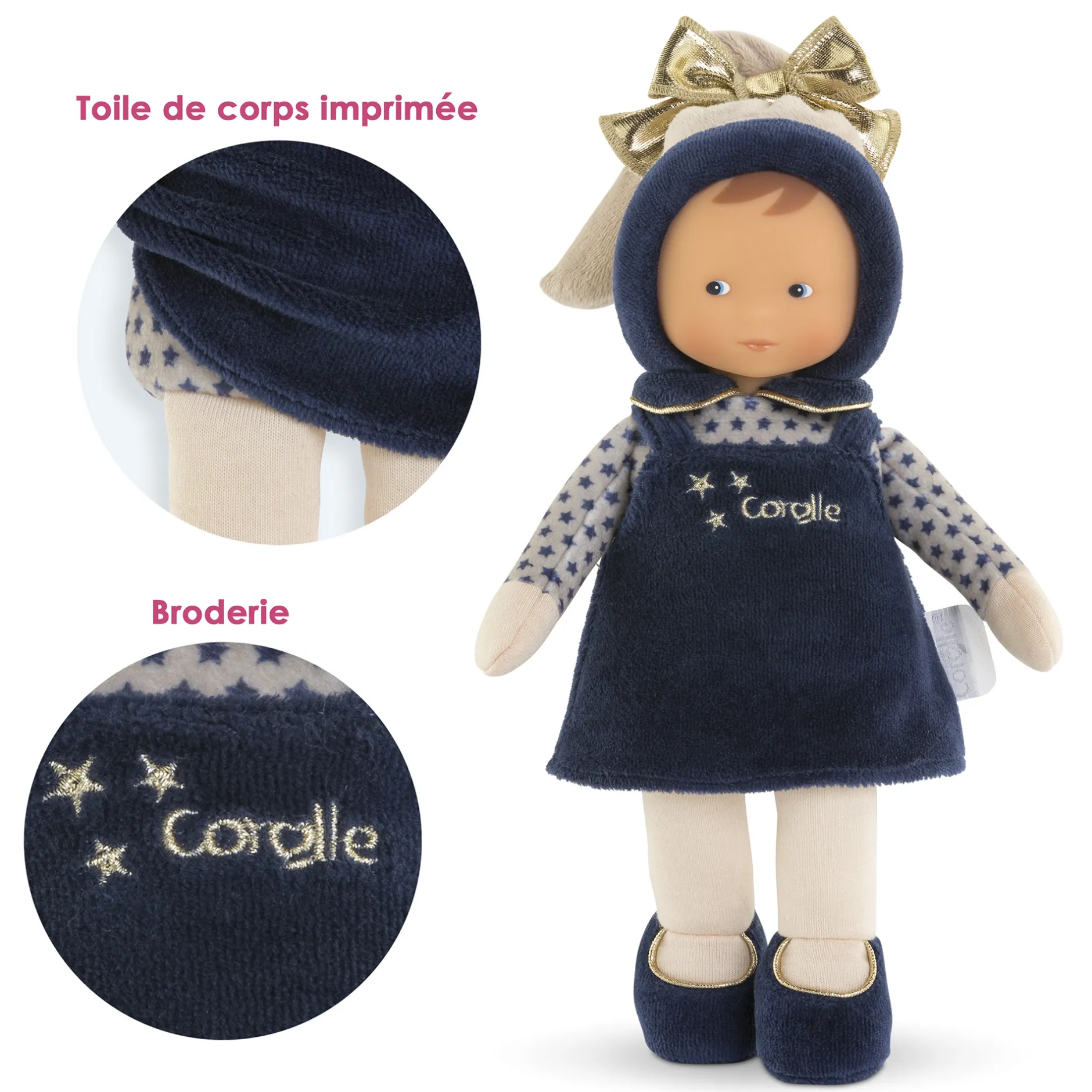 Le doudou Miss Marine Rêves d’Étoiles a la peau blanche et les yeux bleus peints. Elle est habillé d’une robe en velour bleu marine et sa toile de corps est imprimée d’étoiles. Elle porte un bonnet beige tout doux et un joli noeud doré. De jolis détails dorés visibles sur le col claudine, les ballerine et la jolie broderie Corolle avec 3 petites étoiles brodées viennent sublimer cette Miss.