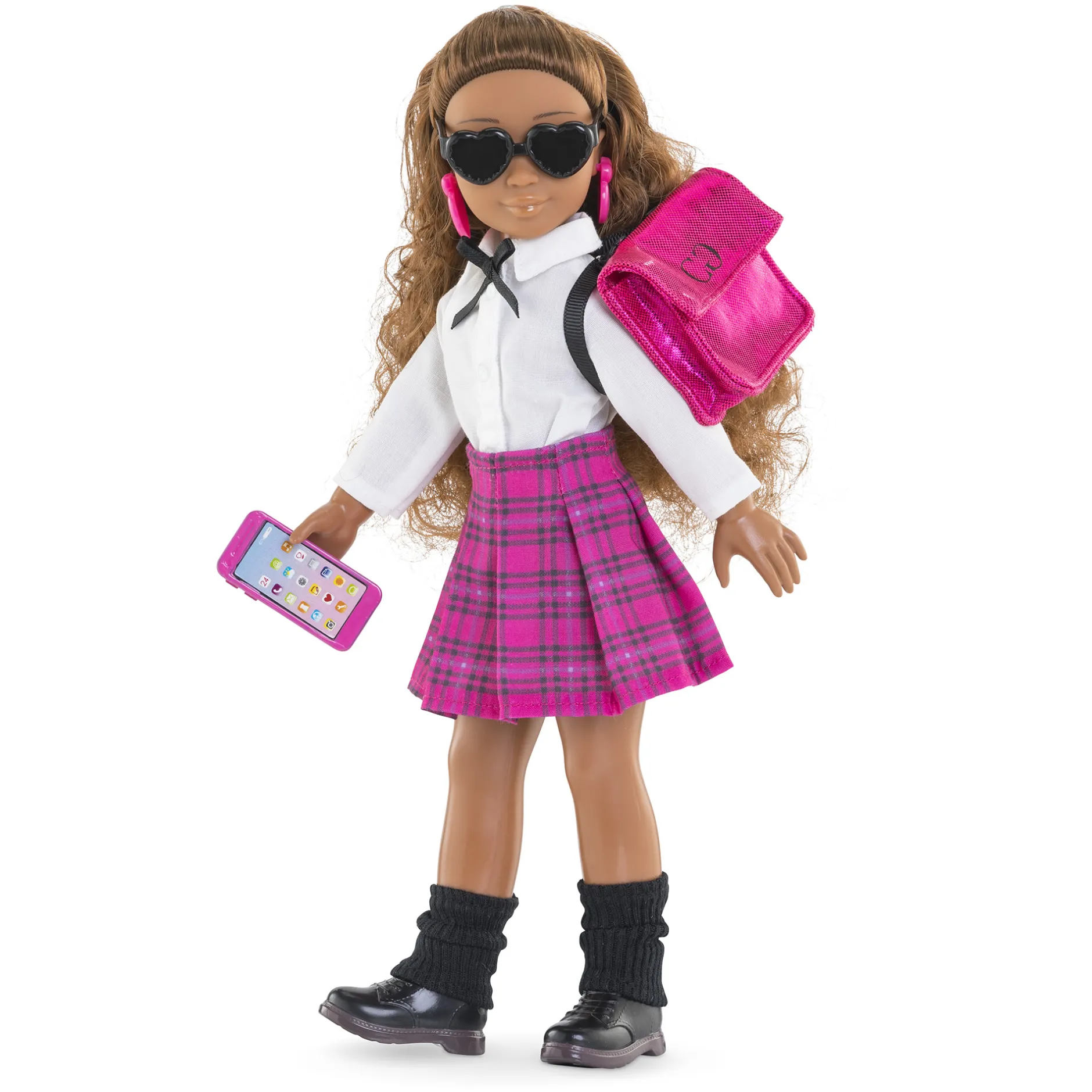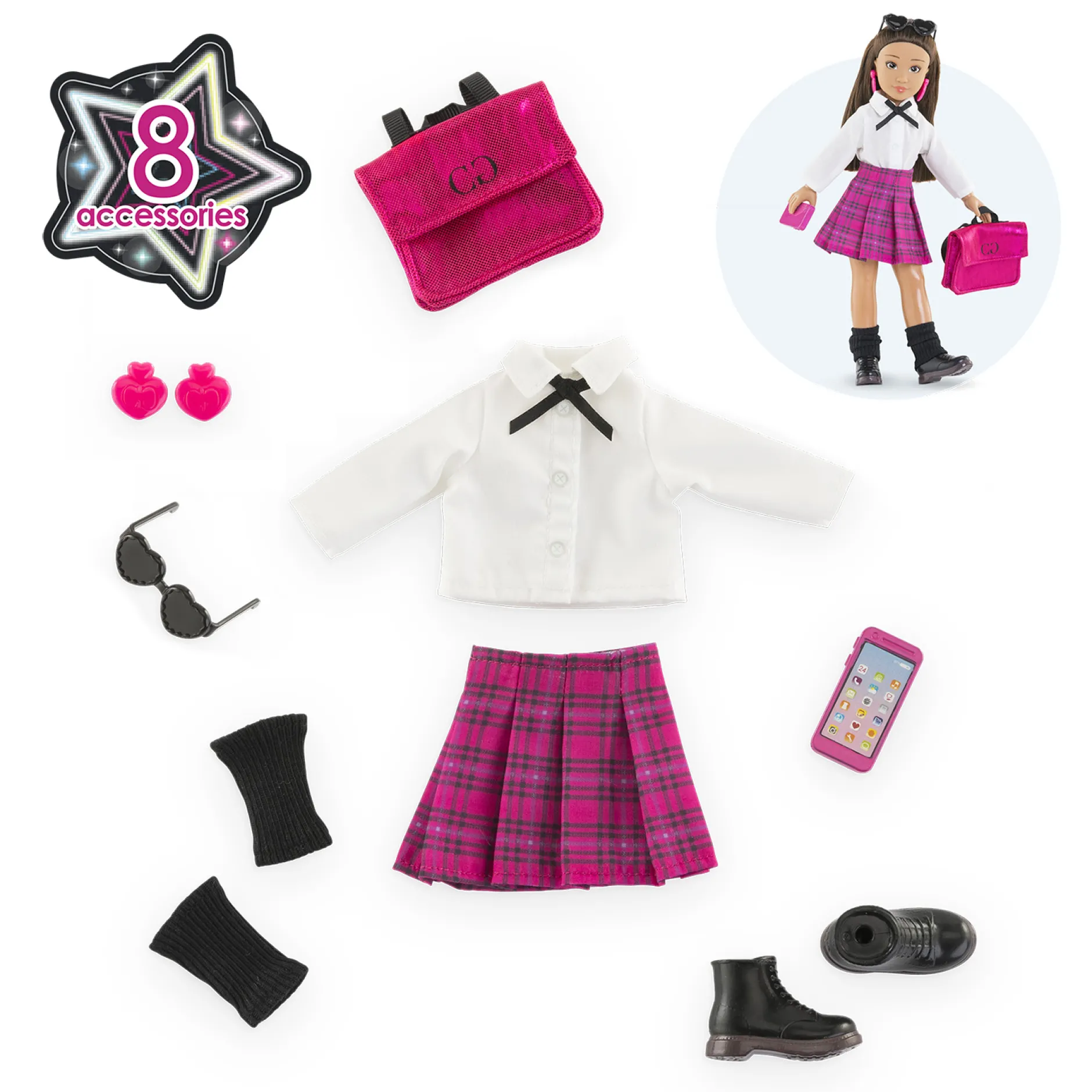 Le Dressing Collège Anglais constitue une tenue complète pour les poupées mannequins Corolle Girls, composée de 8 accessoires ultra-tendance pour ressembler à une étudiante anglaise : 1 jupe rose à carreaux, 1 chemise blanche à manches longues avec un nœud noir, 1 paire de boucles d’oreilles, 1 paire de lunettes de soleil noires en forme de cœurs, 1 téléphone portable rose, 1 cartable rose, 1 paire de guêtres noires et 1 paire de pieds-bottines noires amovibles.