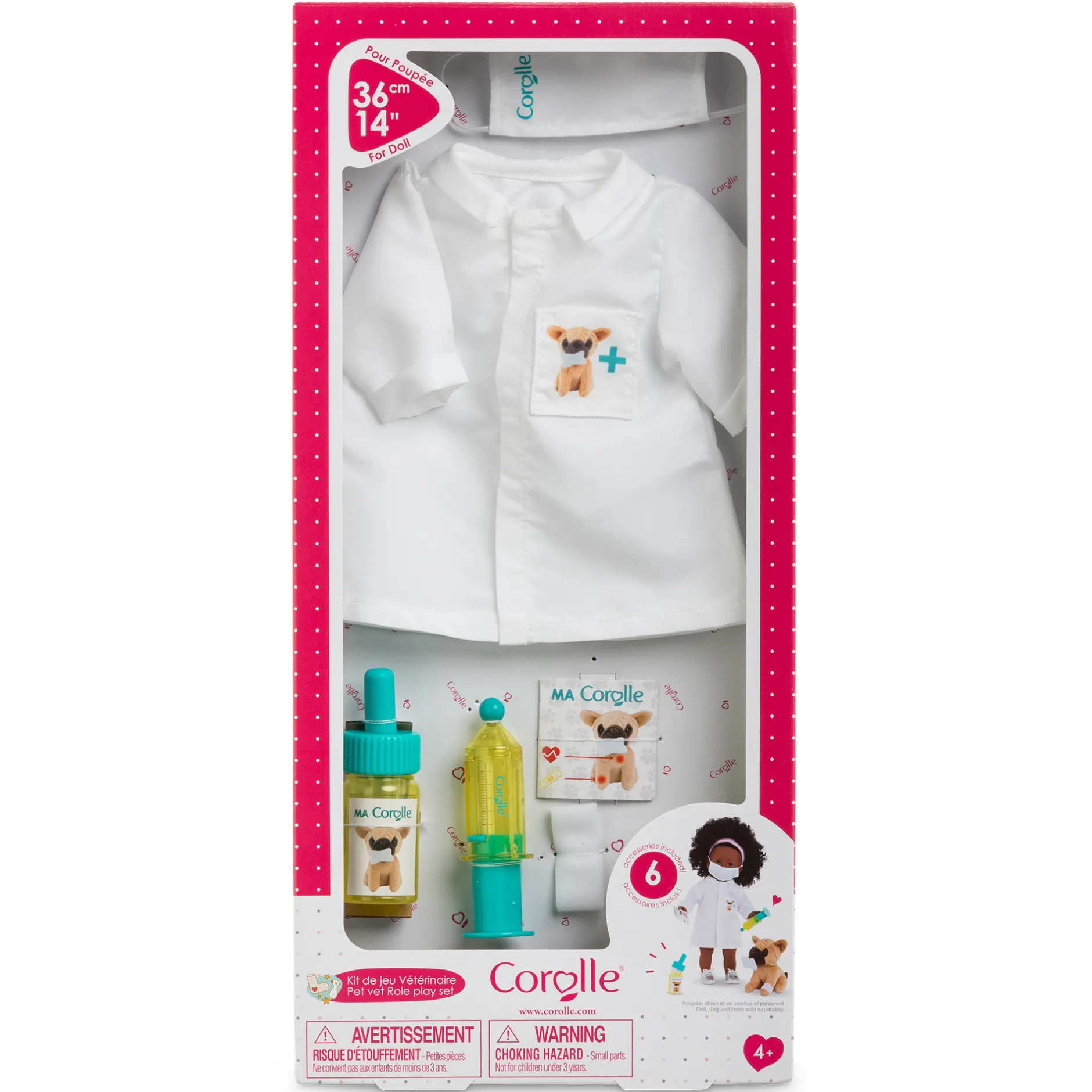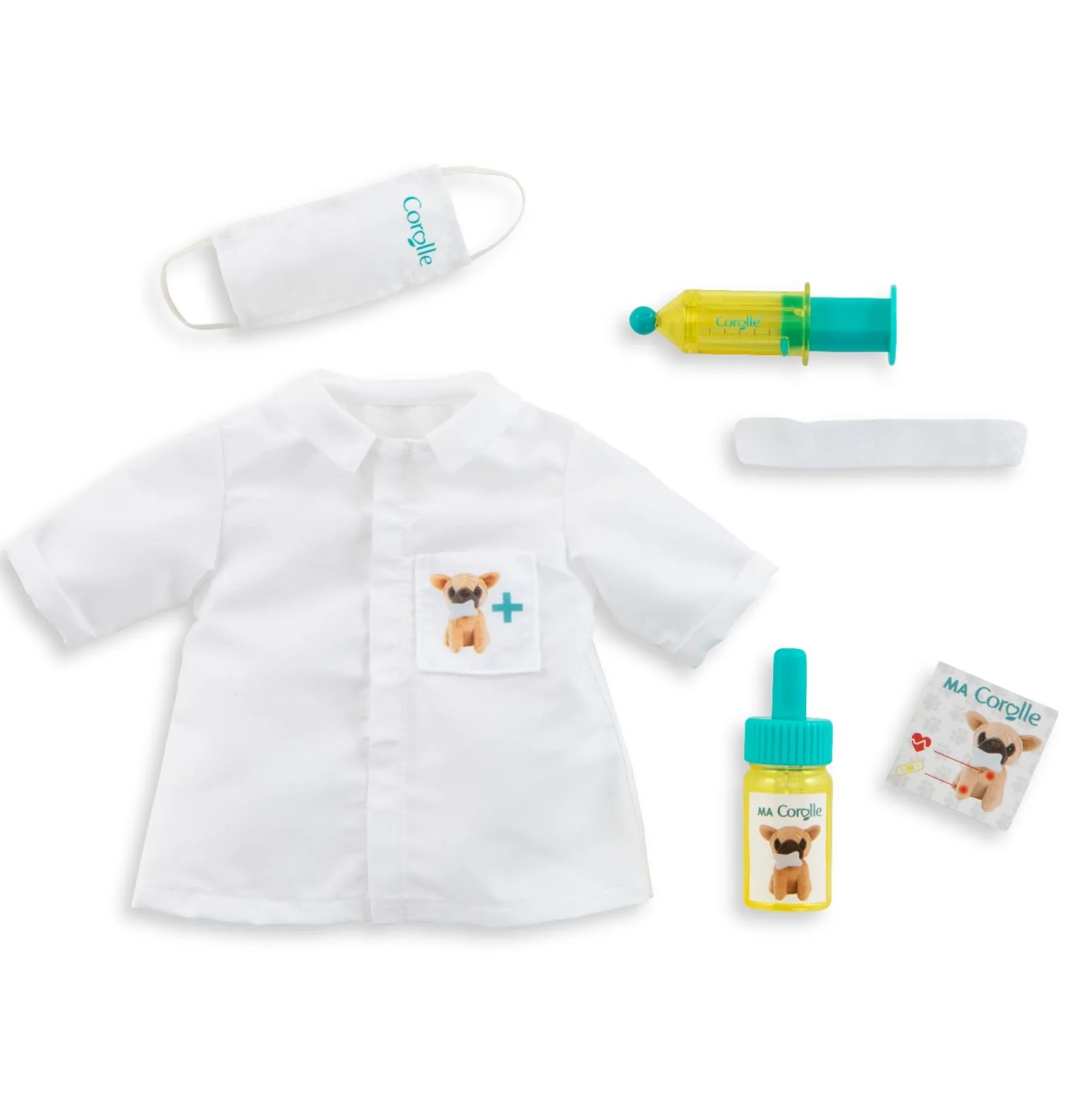 Le kit de jeu parfait pour poupée ma Corolle pour jouer au vétérinaire. 6 accessoires pour équiper la poupée et soigner les animaux : 1 masque chirurgical, 1 blouse avec un vraie poche, 1 seringue, 1 flacon de médicaments, 1 bandage et 1 carnet de vaccins.