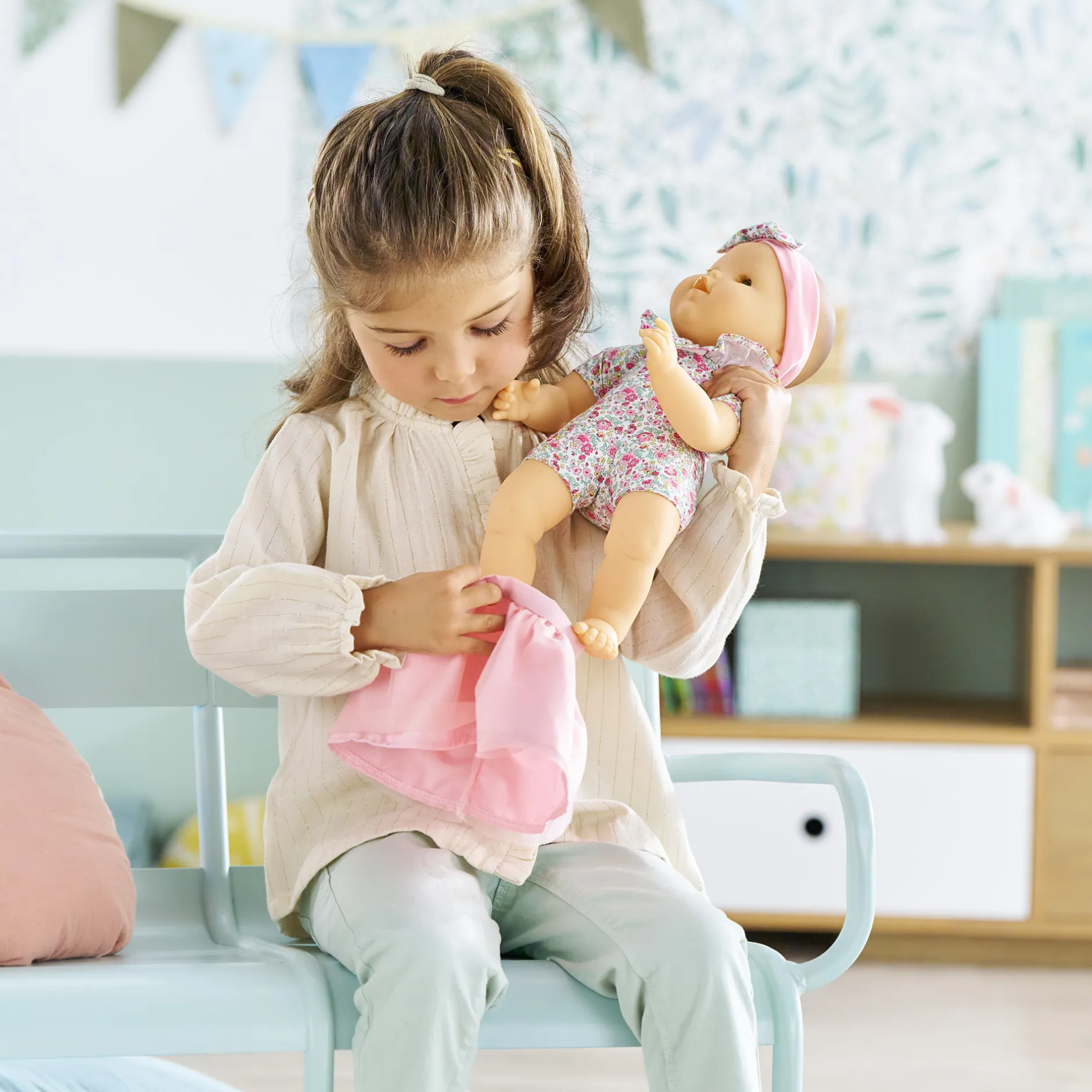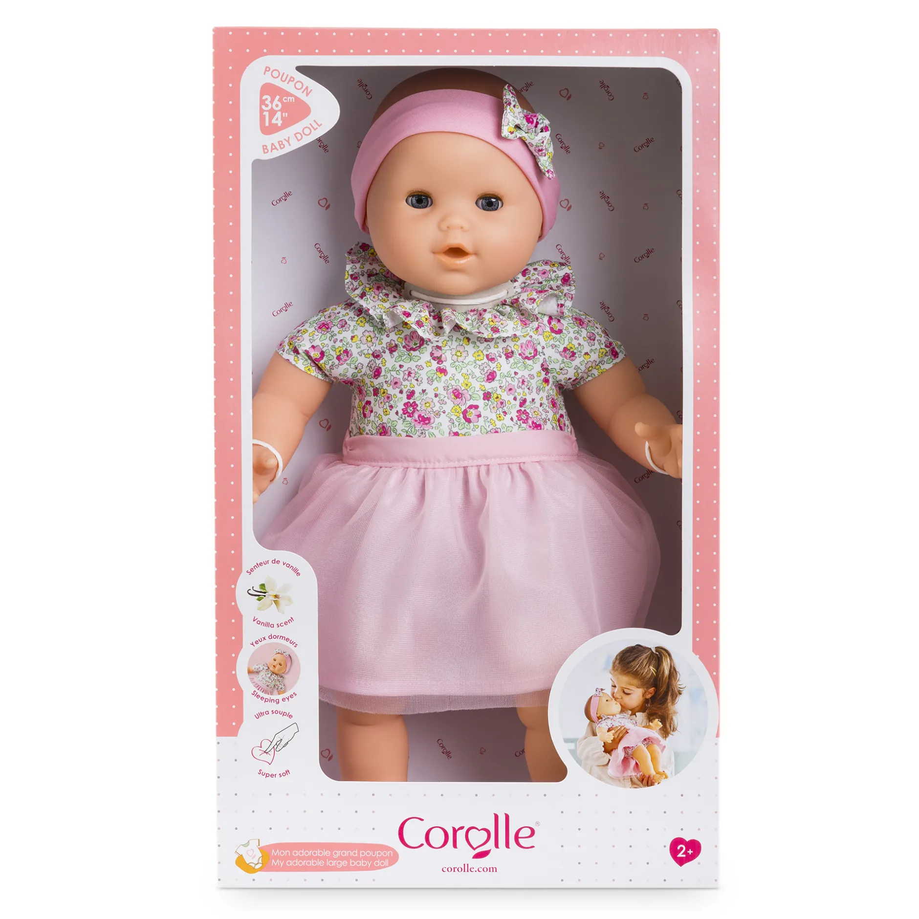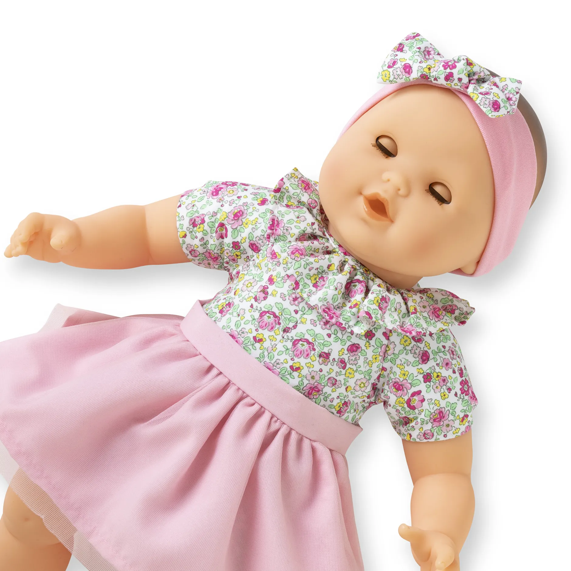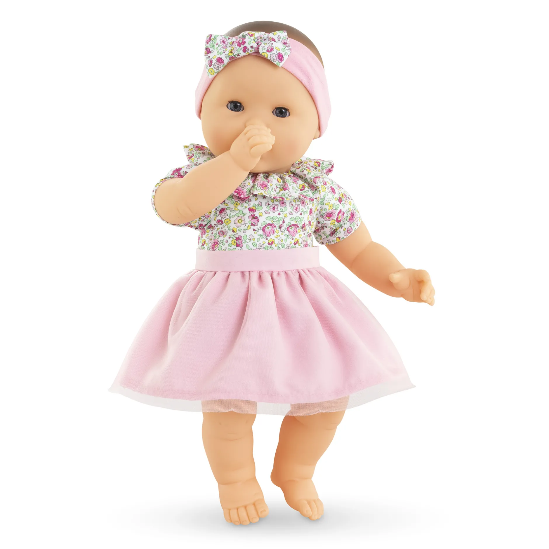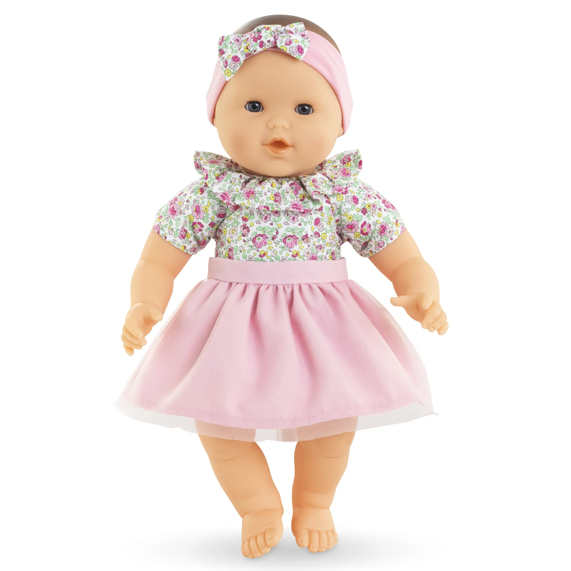 Habillé du joli tissu fleuri de sa toile de corps, Mon Adorable Grand Poupon se distingue par sa collerette assortie, directement cousue autour de son cou. Il possède aussi un tutu en tulle tout doux qui est amovible pour varier les tenues ! Le tout est complété par un bandeau assorti qui ajoute une touche finale à ce look plein de tendresse.