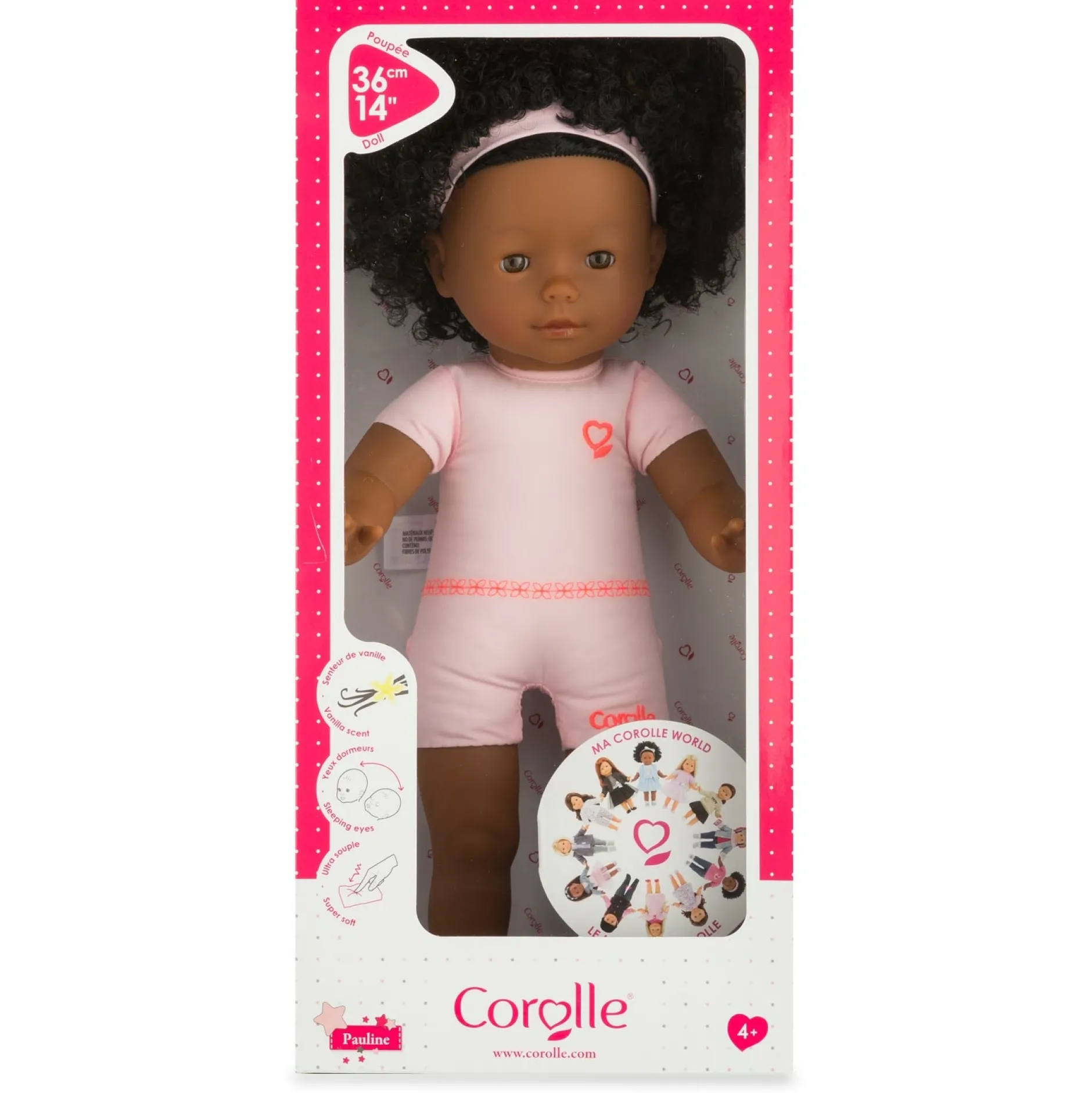 La Poupée à habiller ma Corolle Pauline est une poupée à la peau noire de 36 cm au corps souple « effet » sous-vêtement avec des cheveux frisés à coiffer. Elle a les yeux marron.