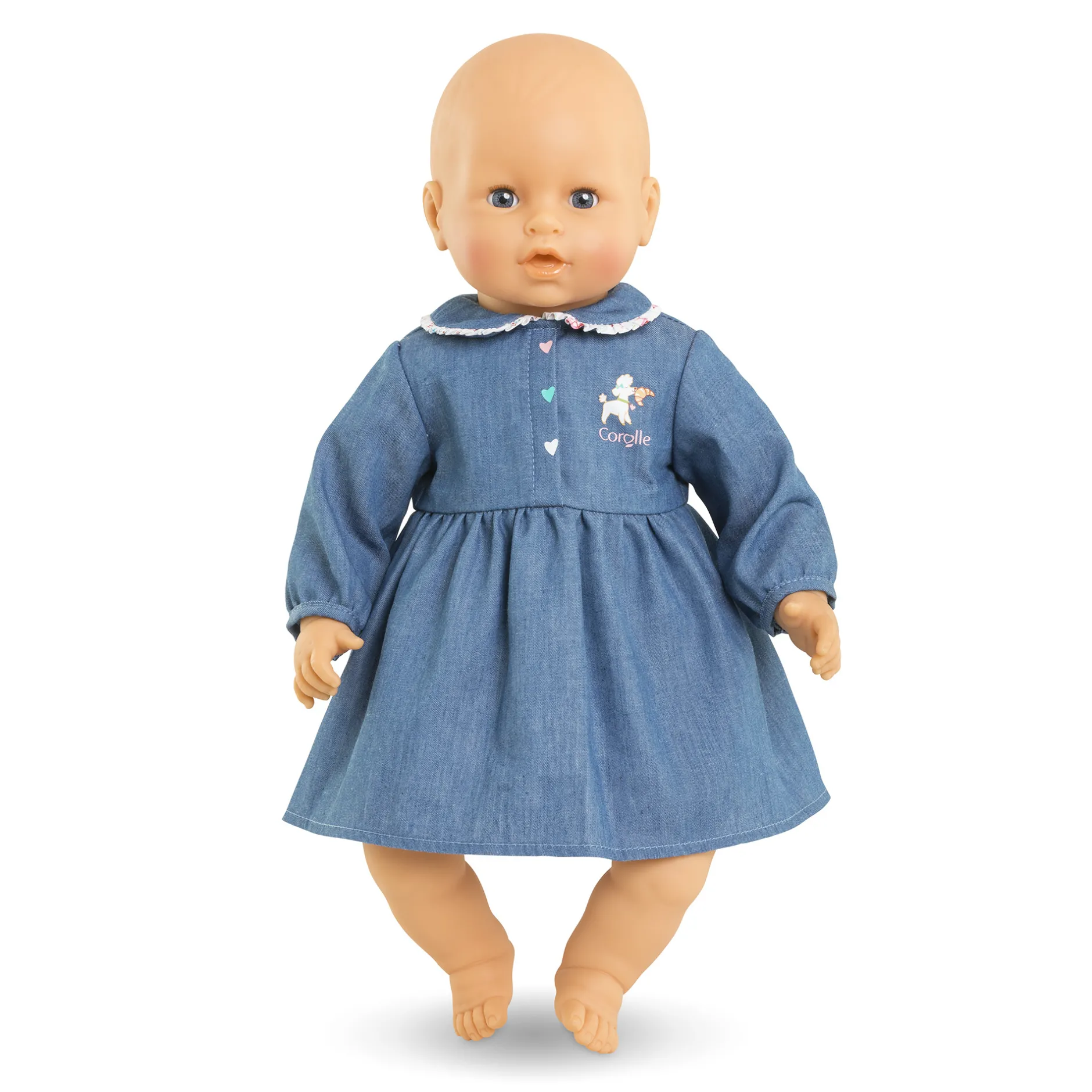 Sur la poitrine, une adorable sérigraphie de petit chien, accompagné du logo Corolle,apporte une note ludique à la tenue tandis que les petites broderies boutons en forme de coeurs colorés sur le devant accentuent le côté tendre et amusant de la robe.