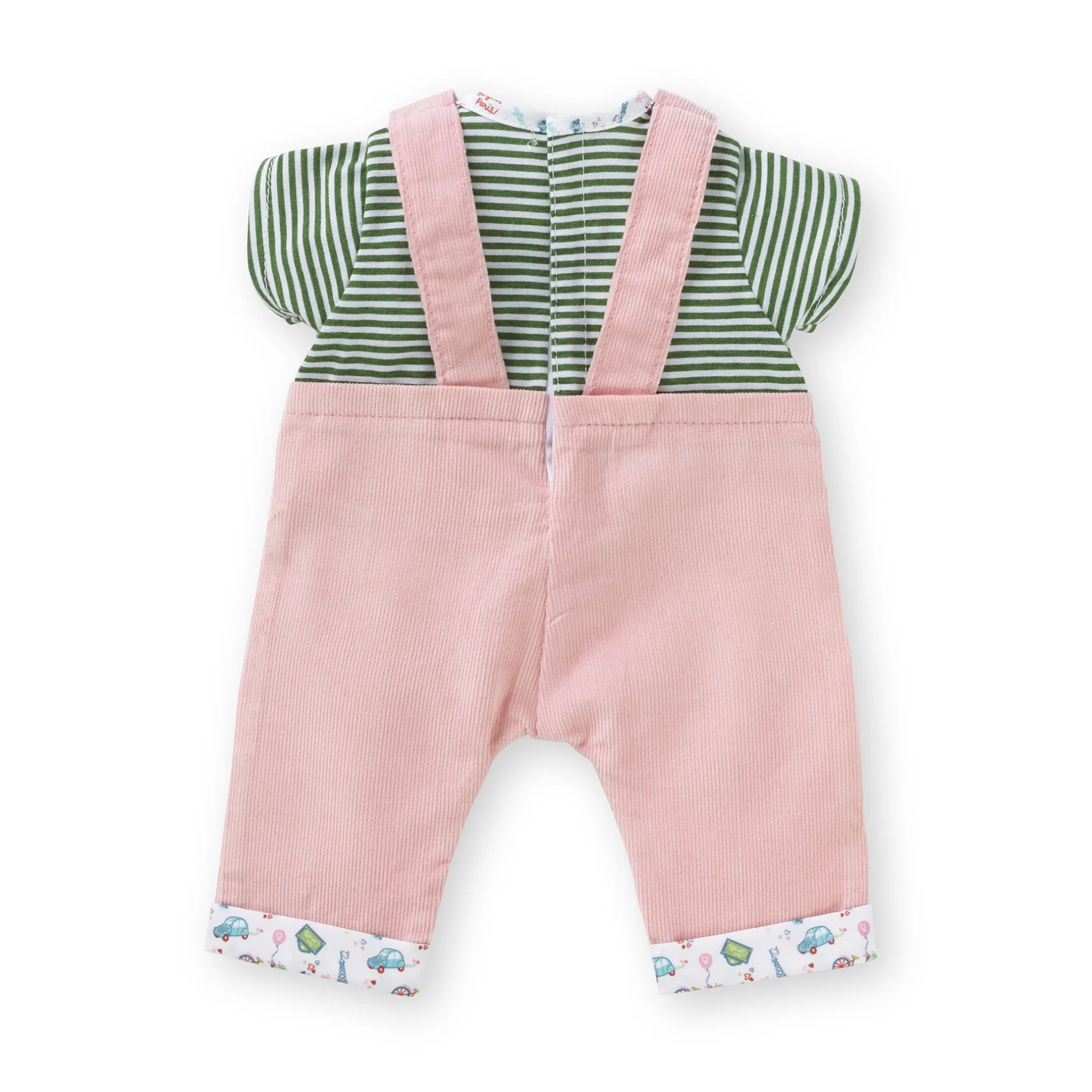 Cet ensemble « tout-en-un » se compose d’une salopette en velours côtelé rose et d’un t-shirt rayé vert et blanc.